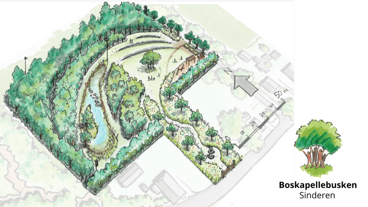 Een belangrijk punt dat werd genoemd is veiligheid. Dat is dan ook de reden dat er voor een goede afrastering rondom de poel is gekozen. Ook rondom de speelplek zal een hekje komen voor wat extra veiligheid. Met dezelfde reden is ervoor gekozen om de ingang van het buurtbos aan de kant van de Boskapelle te maken, omdat er op de Kapelweg hard wordt gereden. Vanaf de Kapelweg is er wel een zichtlijn ingetekend, zodat ook vanaf daar te zien is dat hier iets bijzonders is. Tevens is (rolstoel)toegankelijkheid erg belangrijk, hier wordt in het projectplan ook rekening mee gehouden. Dit alles resulteerde in een nieuwe schets: